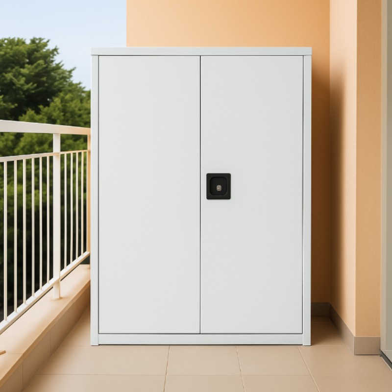 Δίφυλλη μεταλλική ντουλάπα για πλυντήριο-στεγνωτήριο κατασκευασμένη από γαλβανιζέ χάλυβα πάχους 0,6mm (πόρτες/πλευρές/οροφή) , βαμμένη με ειδική ηλεκτροστατική βαφή για maximum αντοχές στις καιρικές συνθήκες και τις διαβρώσεις.
