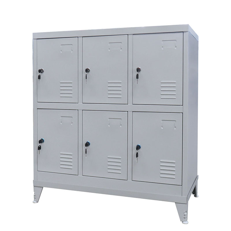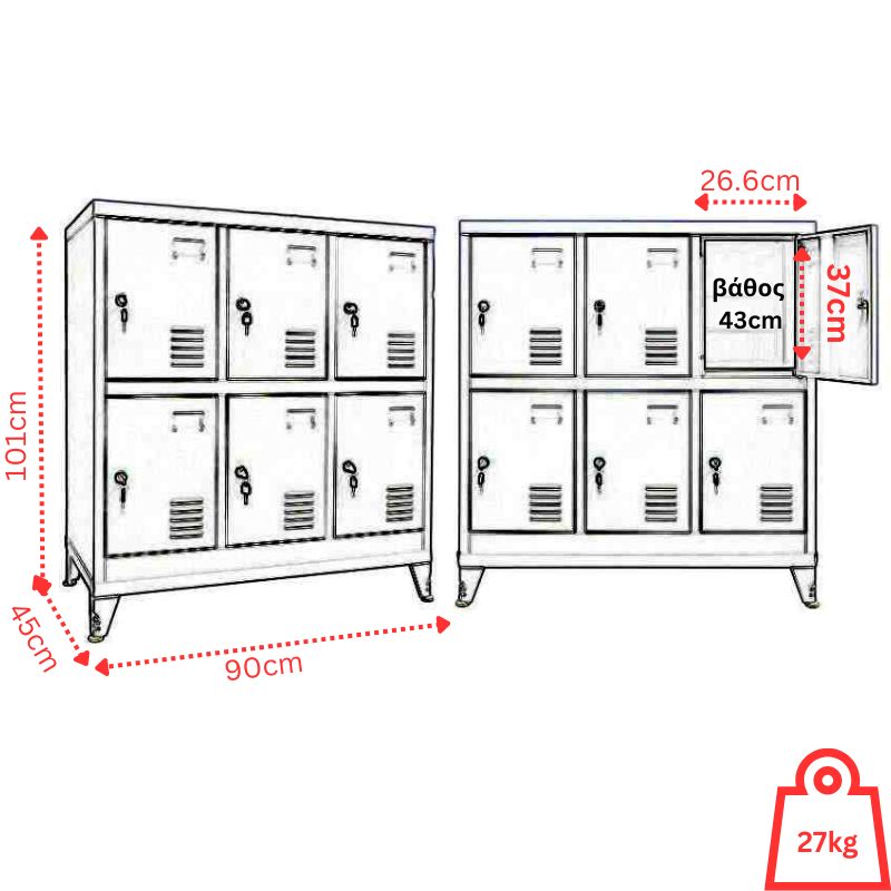Μεταλλική ντουλάπα - φοριαμός (locker) 6 αποθηκευτικών χώρων κατασκευασμένη εξ'ολοκλήρου από μέταλλο βαμμένο με ηλεκτροστατική βαφή. Διαθέτει 6 κλειδαριές (περιλαμβάνονται τα αντικλείδια), 4 ρυθμιζόμενα πόδια τα οποία μπορούν να ρυθμίσουν το ύψος επιτρέποντας την τοποθέτησης της ακόμη και σε ''ανώμαλο'' έδαφος και μεταλλικούς μεντεσέδες. Μεγάλο της πλεονέκτημα είναι ότι δεν παραδίδεται συναρμολογημένη, αλλά σε μορφή επίπεδων πακέτων, ώστε να καταλαμβάνει τον ελάχιστο δυνατό όγκο και να μεταφέρεται με τον πιο εύκολο και οικονομικό τρόπο. Η μεταλλική ντουλάπα (locker) 6 θέσεων είναι κατάλληλη για εσωτερικούς χώρους και προσφέρει αποθηκευτικές λύσεις για χώρους εργασίας, ξενοδοχεία, αποδυτήρια γηπέδων σχολείων κ.α. Παρέχονται αναλυτικές οδηγίες συναρμολόγησης.