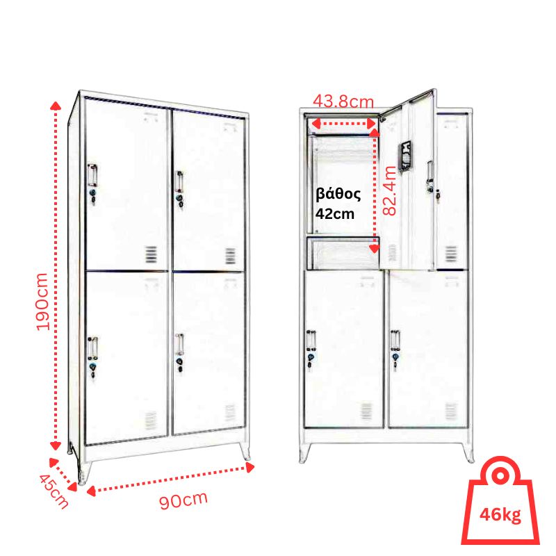 Μεταλλική ντουλάπα - Φοριαμός (locker) με 4 αποθηκευτικά ντουλάπια, κατασκευασμένο από μέταλλο βαμμένο με ηλεκτροστατική βαφή.