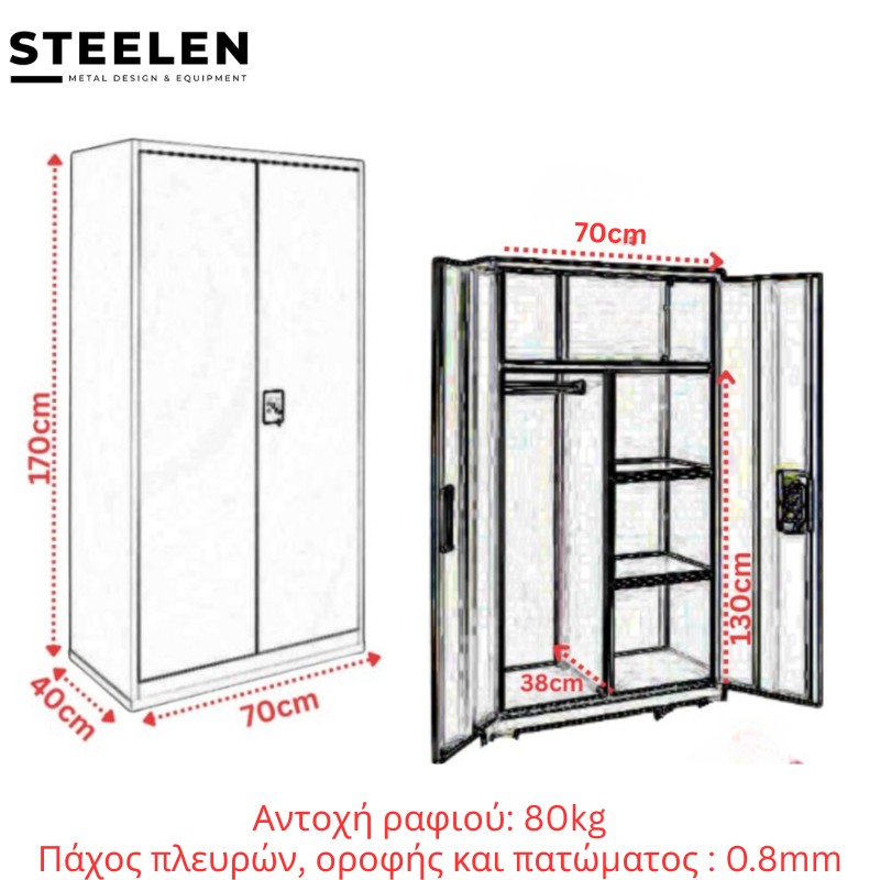 STEELEN Μεταλλική Ντουλάπα 70x40x170cm Γαλβανιζέ Πάχους 0.8mm με Χώρισμα ΧΩΡΙΣ ΠΟΔΙΑ - 5 Αποθηκευτικοί Χώροι