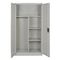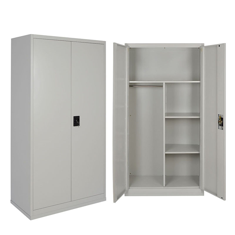 Δίφυλλη μεταλλική ντουλάπα κατασκευασμένη από γαλβανιζέ χάλυβα πάχους 0,6mm (πόρτες/πλευρές/οροφή) και 0,8mm (πάτωμα), βαμμένη με ειδική ηλεκτροστατική βαφή για maximum αντοχές στις καιρικές συνθήκες και τις διαβρώσεις. Διαθέτει 3 μεταλλικά οριζόντια ράφια και 1 κατακόρυφο χώρισμα που ορίζουν 5 αποθηκευτικούς χώρους, είναι κατάλληλη για αποθήκευση ψηλών αντικειμένων και οικοσκευών όπως σκούπες, σφουγγαρίστρες, εργαλεία κ.λ.π αλλά και για ρούχα χάρη στην ανοξείδωτη ράβδο στήριξης. Διαθέτει κλειδαριά ασφαλείας που δεν προεξέχει, πάτωμα με πλευρική και κεντρική ενίσχυση, μεταλλικούς μεντεσέδες και γαλβανιζέ πίρους σε μη εμφανή σημεία. Μεγάλο πλεονέκτημά της είναι ότι δεν παραδίδεται συναρμολογημένη, αλλά σε μορφή επίπεδων πακέτων, ώστε να καταλαμβάνει τον ελάχιστο δυνατό όγκο και να μεταφέρεται με τον πιο εύκολο και οικονομικό τρόπο. Η συναρμολόγηση γίνεται εύκολα και γρήγορα χωρίς να χρειάζονται ειδικές τεχνικές γνώσεις. Είναι κατάλληλη τόσο για εσωτερικούς όσο και για εξωτερικούς στεγασμένους χώρους. Παρέχονται οδηγίες συναρμολόγησης.