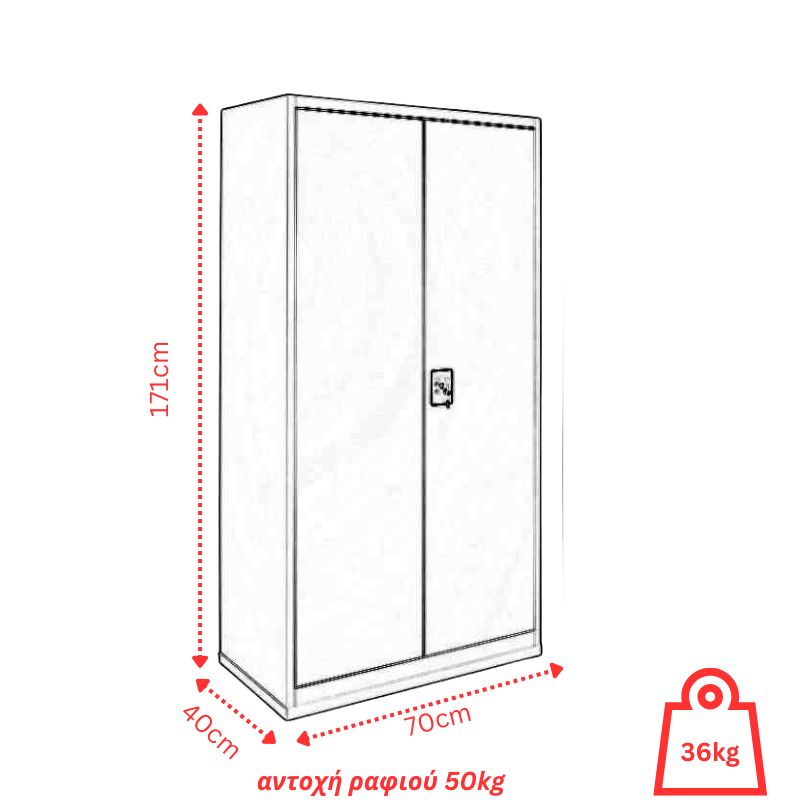 Διαθέτει 4 εσωτερικά μεταλλικά ράφια που ορίζουν 5 αποθηκευτικούς χώρους, πάτωμα με πλευρική και κεντρική ενίσχυση, μεταλλικούς μεντεσέδες και γαλβανιζέ πίρους σε μη εμφανή σημεία, κλειδαριά ασφαλείας με 2 αντικλείδια. Τα 4 εσωτερικά ράφια τοποθετούνται πάνω σε κλιπς ώστε να μπορούν να αντικατασταθούν εύκολα.