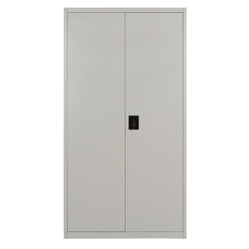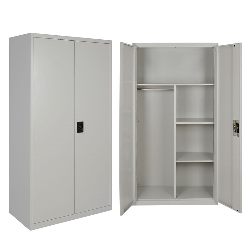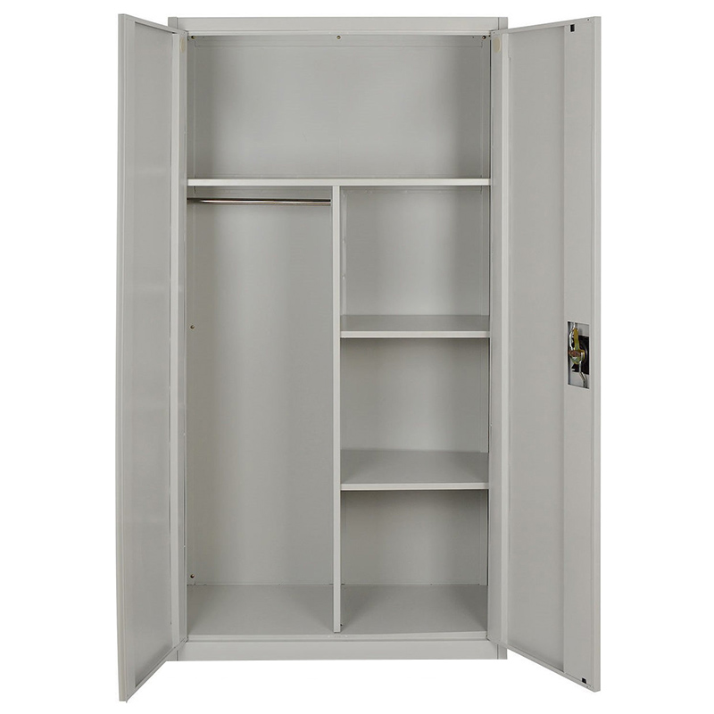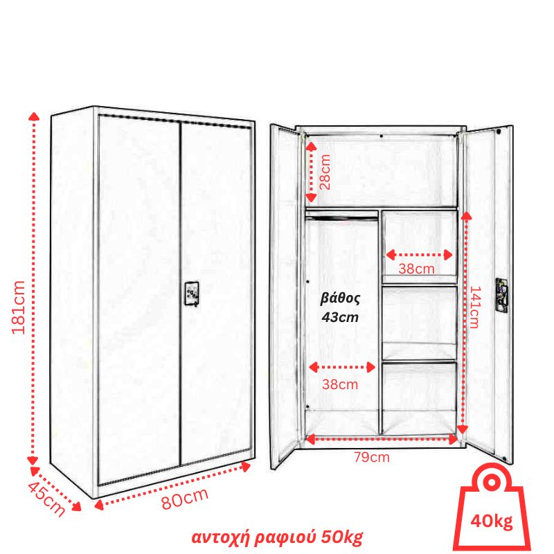 Δίφυλλη μεταλλική ντουλάπα κατασκευασμένη από γαλβανιζέ χάλυβα πάχους 0,6mm (πόρτες/πλευρές/οροφή) και 0,8mm (πάτωμα), βαμμένη με ειδική ηλεκτροστατική βαφή για maximum αντοχές στις καιρικές συνθήκες και τις διαβρώσεις. Διαθέτει 3 μεταλλικά οριζόντια ράφια και 1 κατακόρυφο χώρισμα που ορίζουν 5 αποθηκευτικούς χώρους, είναι κατάλληλη για αποθήκευση ψηλών αντικειμένων και οικοσκευών όπως σκούπες, σφουγγαρίστρες, εργαλεία κ.λ.π αλλά και για ρούχα χάρη στην ανοξείδωτη ράβδο στήριξης. Επίσης, πάτωμα με πλευρική και κεντρική ενίσχυση, μεταλλικούς μεντεσέδες, κλειδαριά ασφαλείας που δεν προεξέχει και γαλβανιζέ πίρους σε μη εμφανή σημεία. Μεγάλο πλεονέκτημά της είναι ότι δεν παραδίδεται συναρμολογημένη, αλλά σε μορφή επίπεδων πακέτων, ώστε να καταλαμβάνει τον ελάχιστο δυνατό όγκο και να μεταφέρεται με τον πιο εύκολο και οικονομικό τρόπο. Η συναρμολόγηση γίνεται εύκολα και γρήγορα χωρίς να χρειάζονται ειδικές τεχνικές γνώσεις. Είναι κατάλληλη τόσο για εσωτερικούς όσο και για εξωτερικούς στεγασμένους χώρους.