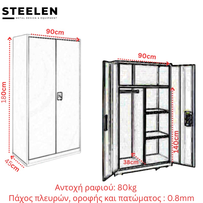 STEELEN Μεταλλική Ντουλάπα 90x45x180cm Γαλβανιζέ Πάχους 0.8mm με Χώρισμα ΧΩΡΙΣ ΠΟΔΙΑ - 5 Αποθηκευτικοί Χώροι