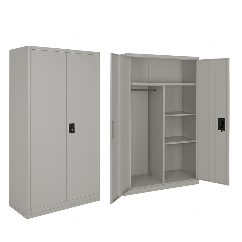 Διαθέτει 3 μεταλλικά οριζόντια ράφια και 1 κατακόρυφο χώρισμα που ορίζουν 5 αποθηκευτικούς χώρους, είναι κατάλληλη για αποθήκευση ψηλών αντικειμένων και οικοσκευών όπως σκούπες, σφουγγαρίστρες, εργαλεία κ.λ.π αλλά και για ρούχα χάρη στην ανοξείδωτη ράβδο στήριξης. Επίσης, πάτωμα με πλευρική και κεντρική ενίσχυση, μεταλλικούς μεντεσέδες και πίρους σε μη εμφανή σημεία. Διαθέτει κλειδαριά ασφαλείας που δεν προεξέχει.