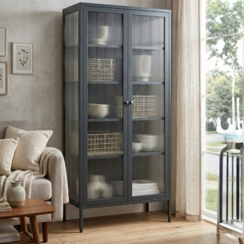 Η ντουλάπα διαθέτει τζάμι  με ημιδιάφανη αμμοβολή (ribbed blurry glass) τόσο στις πόρτες όσο και στα πλαϊνά μέρη, το οποίο προσδίδει μια εκλεπτυσμένη αίσθηση βάθους στον χώρο, επιτρέποντας στο φως να διαχέεται αρμονικά ενώ παράλληλα διατηρεί τη διακριτικότητα του περιεχομένου.