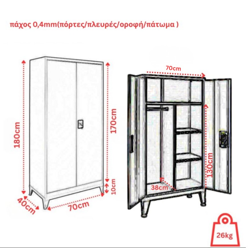 Δίφυλλη μεταλλική ντουλάπα κατασκευασμένη από χάλυβα πάχους 0,4mm (πόρτες/πλευρές/οροφή) , βαμμένη με ειδική ηλεκτροστατική βαφή για maximum αντοχές στις καιρικές συνθήκες και τις διαβρώσεις.