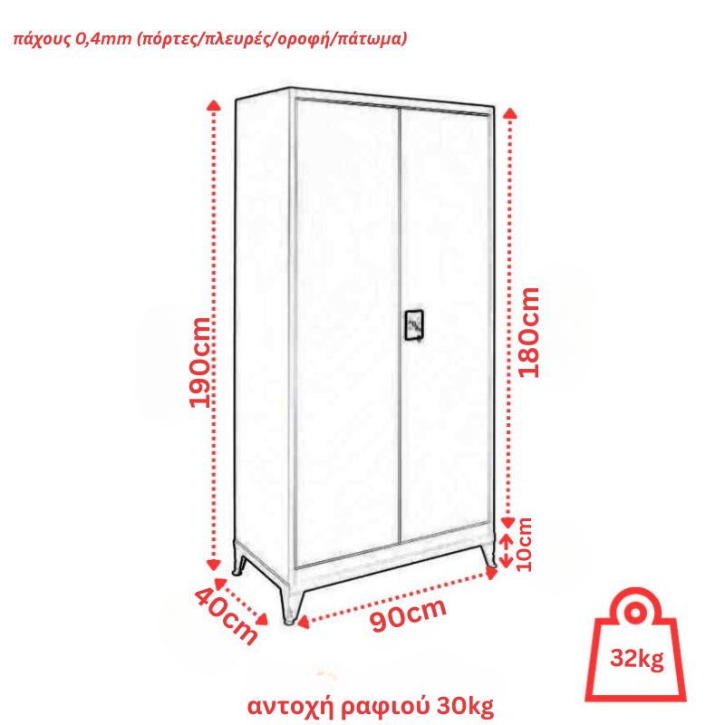 Δίφυλλη μεταλλική ντουλάπα πάχους 0,4mm (πόρτες/πλευρές/οροφή/πάτωμα), βαμμένη με ειδική ηλεκτροστατική βαφή για maximum αντοχές στις καιρικές συνθήκες και τις διαβρώσεις.
