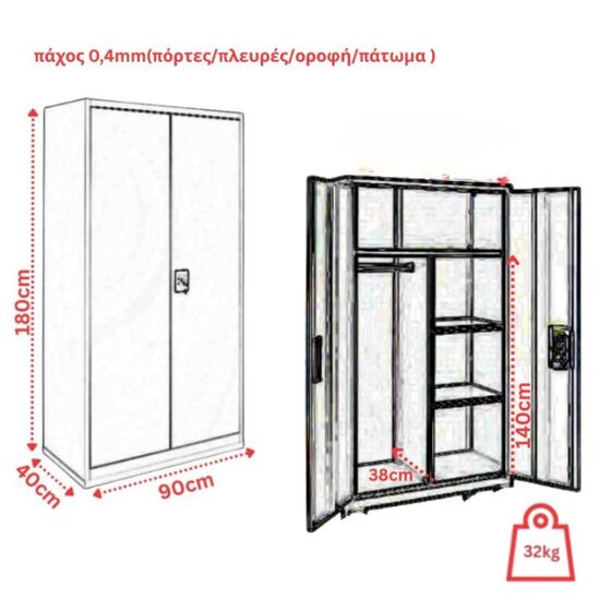 Δίφυλλη μεταλλική ντουλάπα κατασκευασμένη από χάλυβα πάχους 0,4mm (πόρτες/πλευρές/οροφή) , βαμμένη με ειδική ηλεκτροστατική βαφή για maximum αντοχές στις καιρικές συνθήκες και τις διαβρώσεις.
