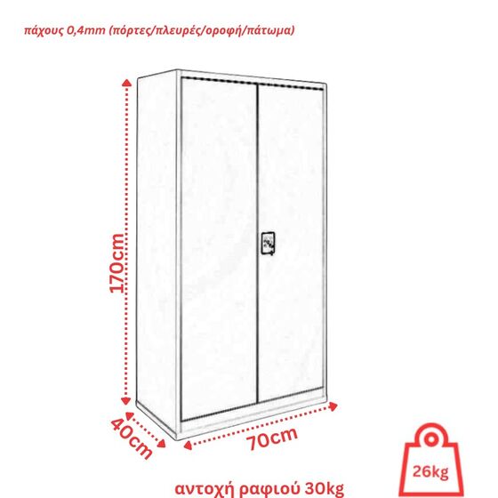 Διαθέτει 4 εσωτερικά μεταλλικά ράφια που ορίζουν 5 αποθηκευτικούς χώρους, πάτωμα με πλευρική και κεντρική ενίσχυση, μεταλλικούς μεντεσέδες και γαλβανιζέ πίρους σε μη εμφανή σημεία και κλειδαριά ασφαλείας με 2 αντικλείδια.