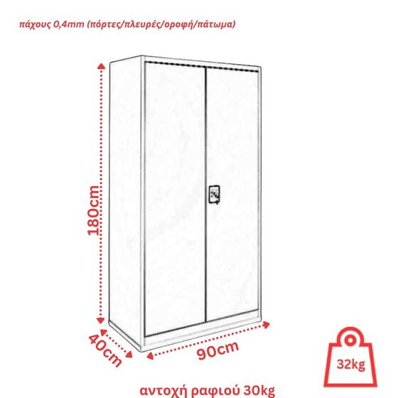 Διαθέτει 4 εσωτερικά ρυθμιζόμενα μεταλλικά ράφια που ορίζουν 5 αποθηκευτικούς χώρους, πάτωμα με πλευρική και κεντρική ενίσχυση, μεταλλικούς μεντεσέδες και πίρους σε μη εμφανή σημεία και κλειδαριά ασφαλείας με 2 αντικλείδια.
