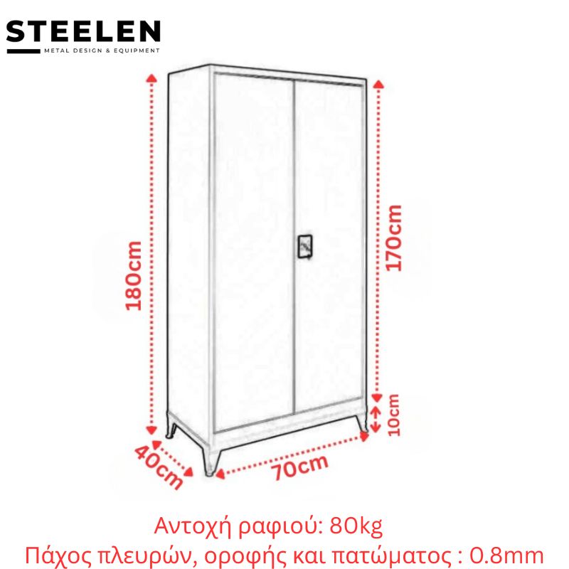 Δίφυλλη μεταλλική ντουλάπα κατασκευασμένη από γαλβανιζέ χάλυβα 0,8mm (πόρτες/πλευρές/οροφή/πάτωμα), βαμμένη με ειδική ηλεκτροστατική βαφή για maximum αντοχές στις καιρικές συνθήκες και τις διαβρώσεις.