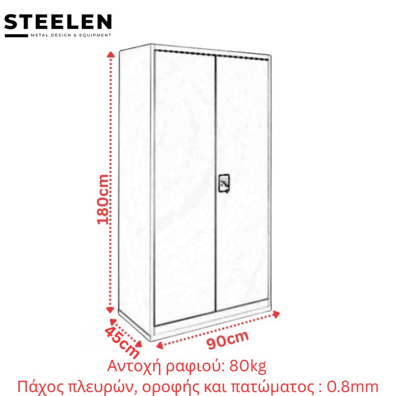 Δίφυλλη μεταλλική ντουλάπα κατασκευασμένη από γαλβανιζέ χάλυβα 0,8mm (πόρτες/πλευρές/οροφή/πάτωμα), βαμμένη με ειδική ηλεκτροστατική βαφή για maximum αντοχές στις καιρικές συνθήκες και τις διαβρώσεις.