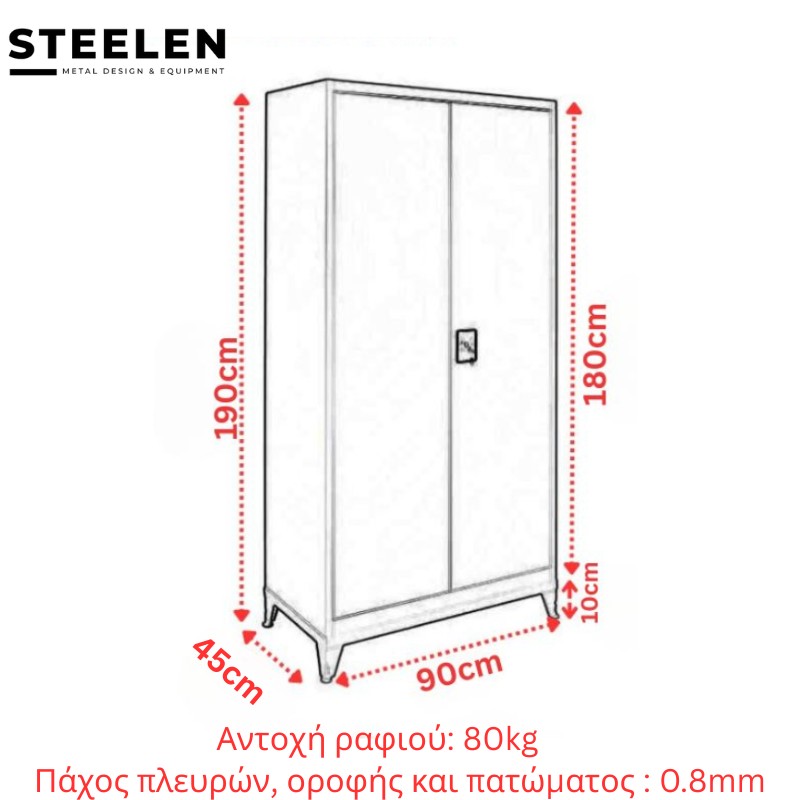 Δίφυλλη μεταλλική ντουλάπα κατασκευασμένη από γαλβανιζέ χάλυβα 0,8mm (πόρτες/πλευρές/οροφή/πάτωμα), βαμμένη με ειδική ηλεκτροστατική βαφή για maximum αντοχές στις καιρικές συνθήκες και τις διαβρώσεις.