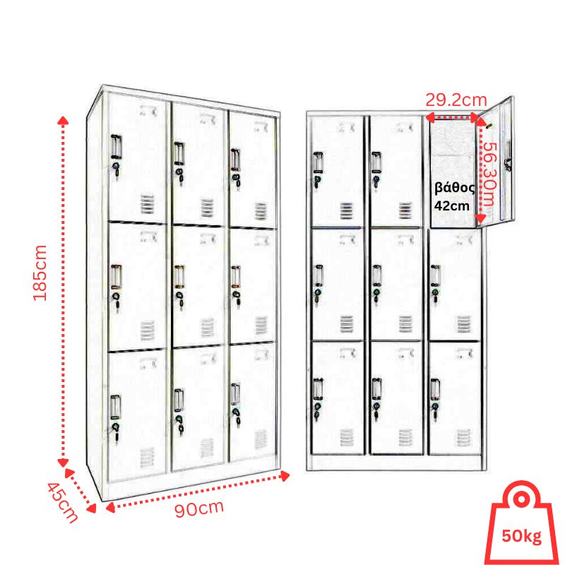 Μεταλλική ντουλάπα - Φοριαμός (locker) με 9 αποθηκευτικά ντουλάπια, κατασκευασμένο από μέταλλο βαμμένο με ηλεκτροστατική βαφή.