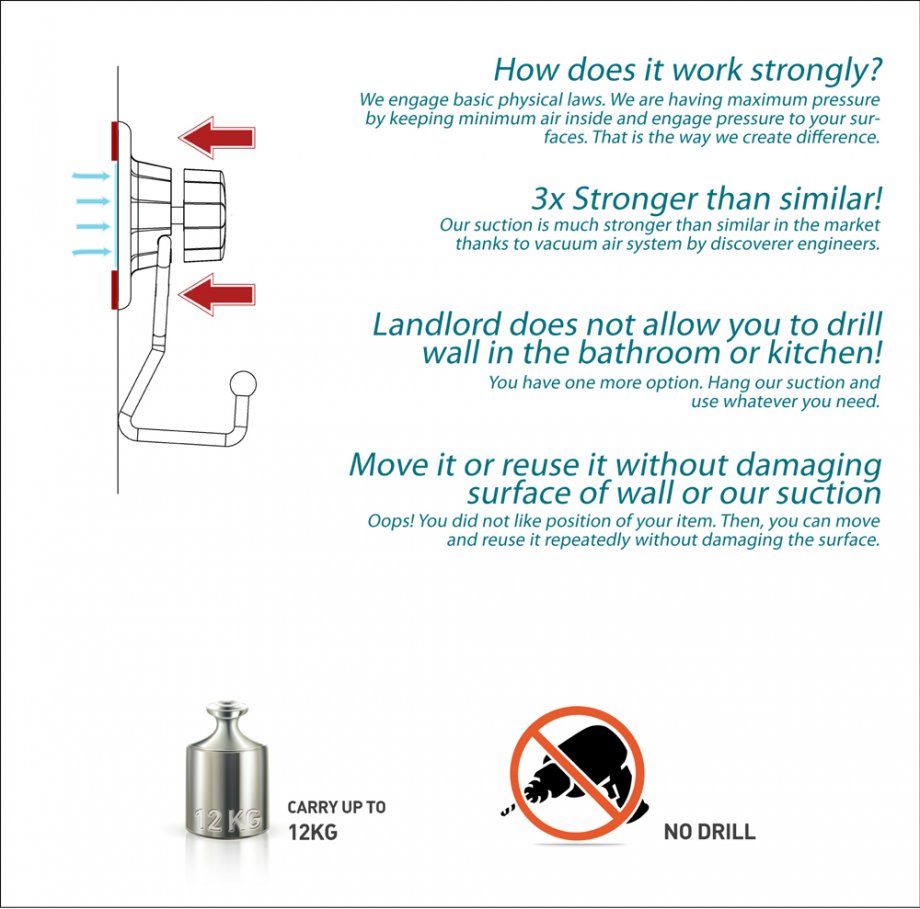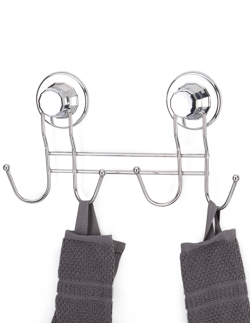 Άγκριστρο τοίχου με 4 υποδοχές για μπουρνούζια και πετσέτες, κατασκευασμένο εξ'ολοκλήρου από επιχρωμιωμένο ατσάλι. Πολύ εύκολη και γρήγορη τοποθέτηση σε λείες επιφάνειες με βεντούζα, είναι 3 φορές πιο σταθερή από τις κοινές βεντούζες λόγω του καινοτόμου μηχανισμού εξαγωγής του αέρα. Αφαιρείται εξίσου εύκολα, χωρίς να αφήνει λεκέδες ή σημάδια στον τοίχο. Ιδανική επιλογή που μπορεί να ταιριάξει απόλυτα με κάθε μπάνιο ή WC. Μπορεί να τοποθετηθεί και σε μη λείες επιφάνειες με βίδες (περιλαμβάνονται στη συσκευασία).