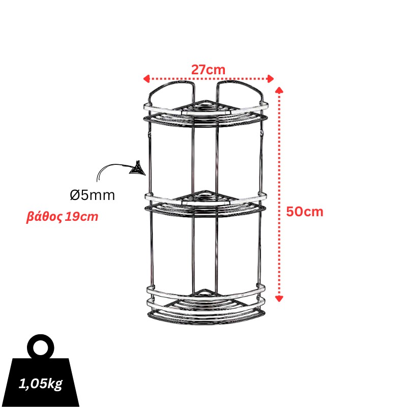 Γωνιακή εταζέρα μπάνιου με 3 ράφια για αφρόλουτρα, σαμπουάν κ.α είδη υγιεινής, κατασκευασμένη εξ'ολοκλήρου από ανοξείδωτο ατσάλι (INOX) με ματ όψη. Πρακτική λύση για το μπάνιο, μπορεί να τοποθετηθεί σε οποιαδήποτε γωνία και να λειτουργήσει ως βοηθητικός ή αποθηκευτικός χώρος. Ιδανικό σε περιπτώσεις που η εξοικονόμηση χώρου είναι σημαντική.