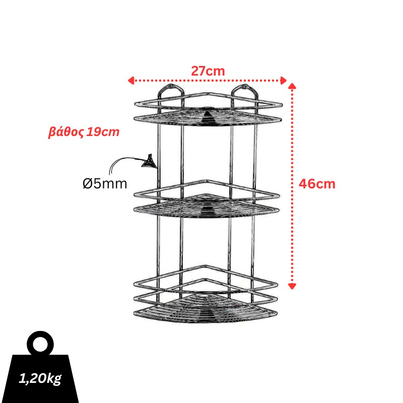 TEKNO-TEL Γωνιακή Ραφιέρα Μπάνιου INOX (Ανοξείδωτο Ατσάλι) 3όροφη 27x19x46cm Βάρος 1.20kg Πάχος Ø5mm