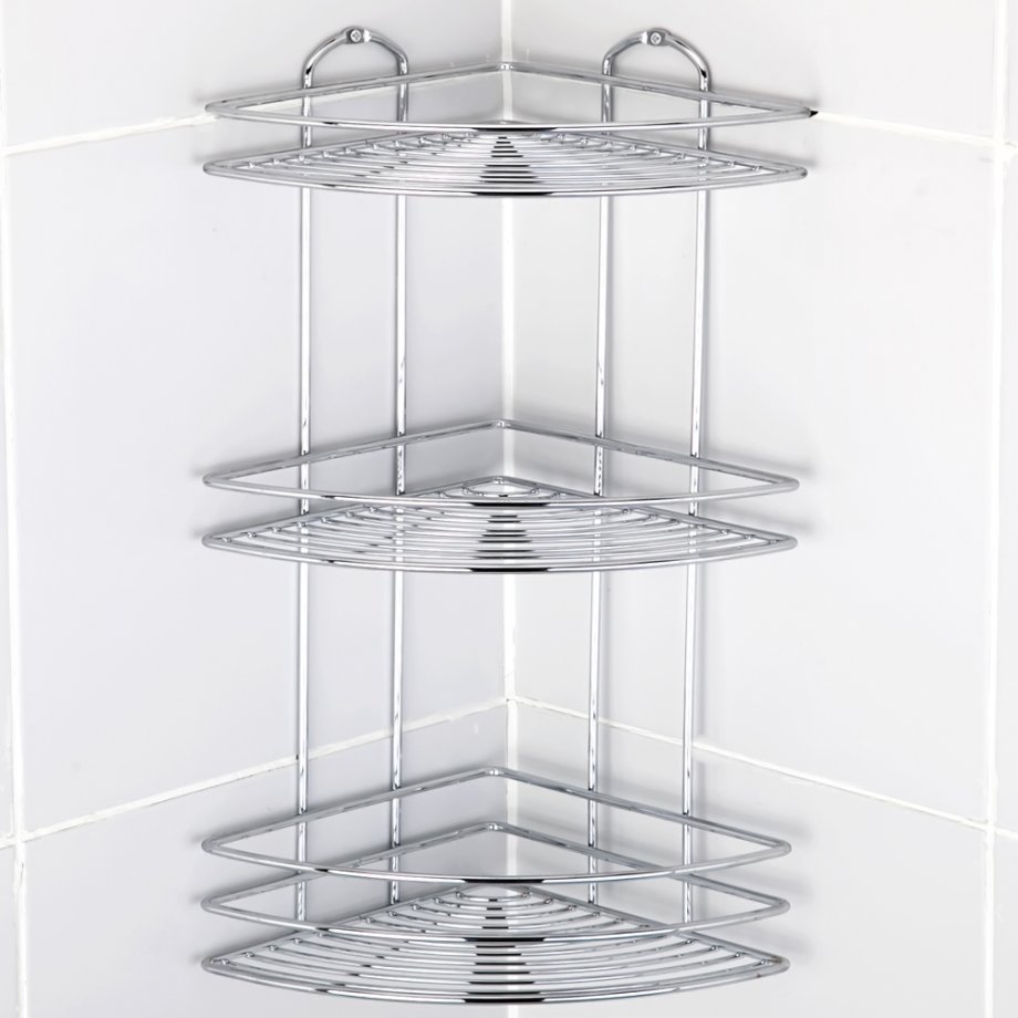 Γωνιακή εταζέρα τοίχου μπάνιου με 3 ράφια για αφρόλουτρα, σαμπουάν κ.α είδη υγιεινής, κατασκευασμένη εξ'ολοκλήρου από ανοξείδωτο ατσάλι. Πρακτική λύση για το μπάνιο, μπορεί να τοποθετηθεί σε οποιαδήποτε γωνία με βίδες και να λειτουργήσει ως βοηθητικός ή αποθηκευτικός χώρος. Ιδανικό σε περιπτώσεις που η εξοικονόμηση χώρου είναι σημαντική.