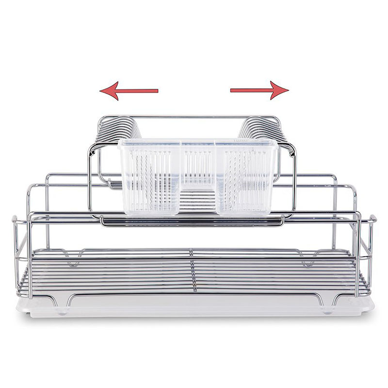 Στεγνωτήρι πιάτων κατασκευασμένο από ανοξείδωτο ατσάλι (ΙΝΟΧ). Διαθέτει δύο επίπεδα αποστράγγισης με αποσπώμενο το επάνω επίπεδο για εξοικονόμηση χώρου και άνετη αποθήκευση. Το άνω επίπεδο μετακινείται σε σχέση με το κάτω δημιουργώντας τον κατάλληλο χώρο αποστράγγισης για μεγαλύτερα σκεύη όπως κατσαρόλες και ταψιά ενώ παρέχει χώρο για 10 πιάτα.Το κάτω επίπεδο χρησιμοποιείται για τοποθέτηση ποτηριών και διαφόρων άλλων σκευών. Το στεγνωτήρι επίσης διαθέτει κουταλοθήκη τριών θέσεων για κουτάλια, πηρούνια, μαχαίρια και πλαστικό δίσκο στην βάση για τη συλλογή του νερού.