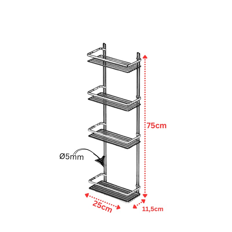 TEKNO-TEL Ραφιέρα Μπάνιου Τοίχου 4όροφη 25x11.5x75cm Πάχος Ø5mm Επιχρωμιωμένο Ατσάλι Μαύρη