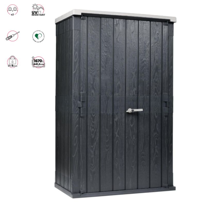Αποθήκη κήπου δίφυλλη, βαρέως, τύπου που συνδυάζει με μοναδικό τρόπο κορυφαία ποιότητα κατασκευής και αισθητική, κατασκευασμένη από πολυπροπυλένιο, ένα ανθεκτικό στην υπεριώδη ακτινοβολία UV, ανακυκλώσιμο και φιλικό προς το περιβάλλον πλαστικό.