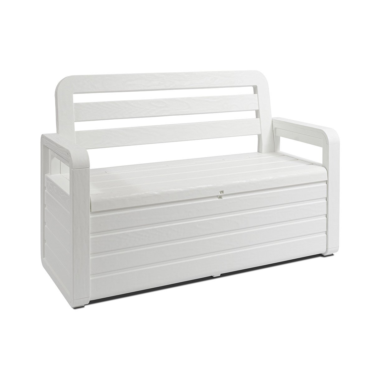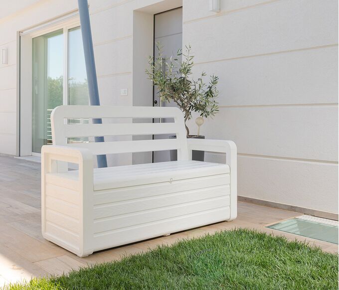 Μπαούλο αποθήκευσης - παγκάκι εξωτερικού χώρου Ιταλικού σχεδιασμού και παραγωγής, κατασκευασμένο εξ'ολοκλήρου από πολυπροπυλένιο, ένα ανθεκτικό πλαστικό μεγάλης αντοχής στην υπεριώδη ακτινοβολία UV και στις ακραίες θερμοκρασίες. Διαθέτει πλάτη και μπράτσα προσφέροντας μεγαλύτερη άνεση στους καθήμενους και χρησιμοποιείται ταυτόχρονα ως κάθισμα/παγκάκι δύο (2) ατόμων και ως μπαούλο αφού διαθέτει και αποθηκευτικό χώρο 270 λίτρων με υποδοχή για λουκέτο (δεν περιλαμβάνεται) στο καπάκι. Η διττή χρήση του προϊόντος και το ελκυστικό design με μοτίβο ξύλου το καθιστά ιδανικό για τη βεράντα, τον κήπο, το γκαράζ, την πισίνα αλλά και σε οποιοδήποτε σημείο σε εσωτερικό ή εξωτερικό χώρο τόσο ως λύση καθίσματος όσο και για την αποθήκευση παιχνιδιών, αξεσουάρ πισίνας, μαξιλαριών κτλ. Το προϊόν παραδίδεται ασυναρμολόγητο για πιο εύκολη και οικονομική μεταφορά ενώ περιλαμβάνονται οδηγίες συναρμολόγησης.