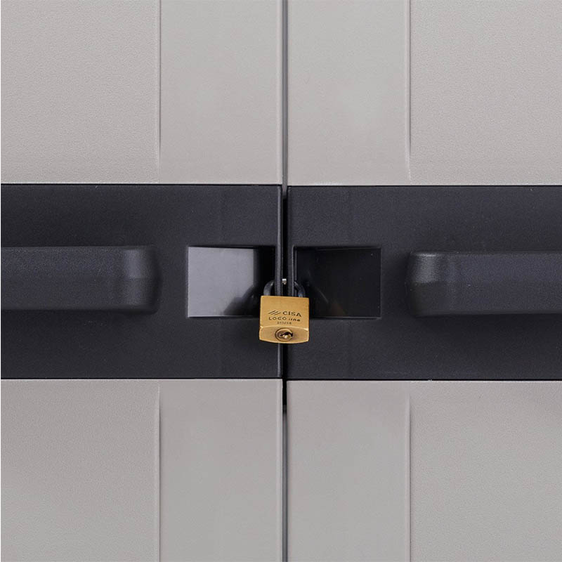 Επιπλέον διαθέτει μεταλλικές λαβές στα χερούλια και υπάρχει η δυνατότητα ασφαλούς κλειδώματος της ντουλάπας (δεν περιλαμβάνεται λουκέτο στη συσκευασία), στην πίσω πλευρά υπάρχουν οπές ασφαλούς στήριξης που επιτρέπουν στη ντουλάπα να βιδωθεί στον τοίχο προσφέροντας μέγιστη ασφάλεια σε περίπτωση ισχυρών ανέμων.