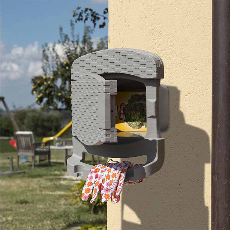 Βάση για λάστιχα κατασκευασμένη εξ'ολοκλήρου από ανθεκτικό πλαστικό στις υψηλές θερμοκρασίες και στην καθημερινή χρήση. Διαθέτει εσωτερικό αποθηκευτικό χώρο για τα σύνεργα κηπουρικής, υποδοχή κλειδαριάς για μεγαλύτερη ασφάλεια του αποθηκευτικού χώρου και 4 υποδοχές για εργαλεία όπως φτυαράκια, γάντια κ.α αξεσουάρ. Με κομψή εμφάνιση (Rattan) και έξυπνο σχεδιασμό, γίνεται ο χρήσιμος αποθηκευτικός χώρος για τον κήπο. Εφαρμόζει στο τοίχο με βίδες.