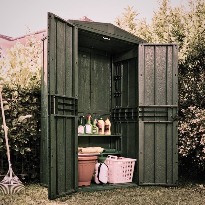Αποθήκη κήπου δίφυλλη βαρέως τύπου, που συνδυάζει με μοναδικό τρόπο κορυφαία ποιότητα κατασκευής και αισθητική και είναι ανθεκτική στην υπεριώδη ακτινοβολία UV. Είναι κατασκευασμένη από ανακυκλώσιμο και φιλικό προς το περιβάλλον πλαστικό.