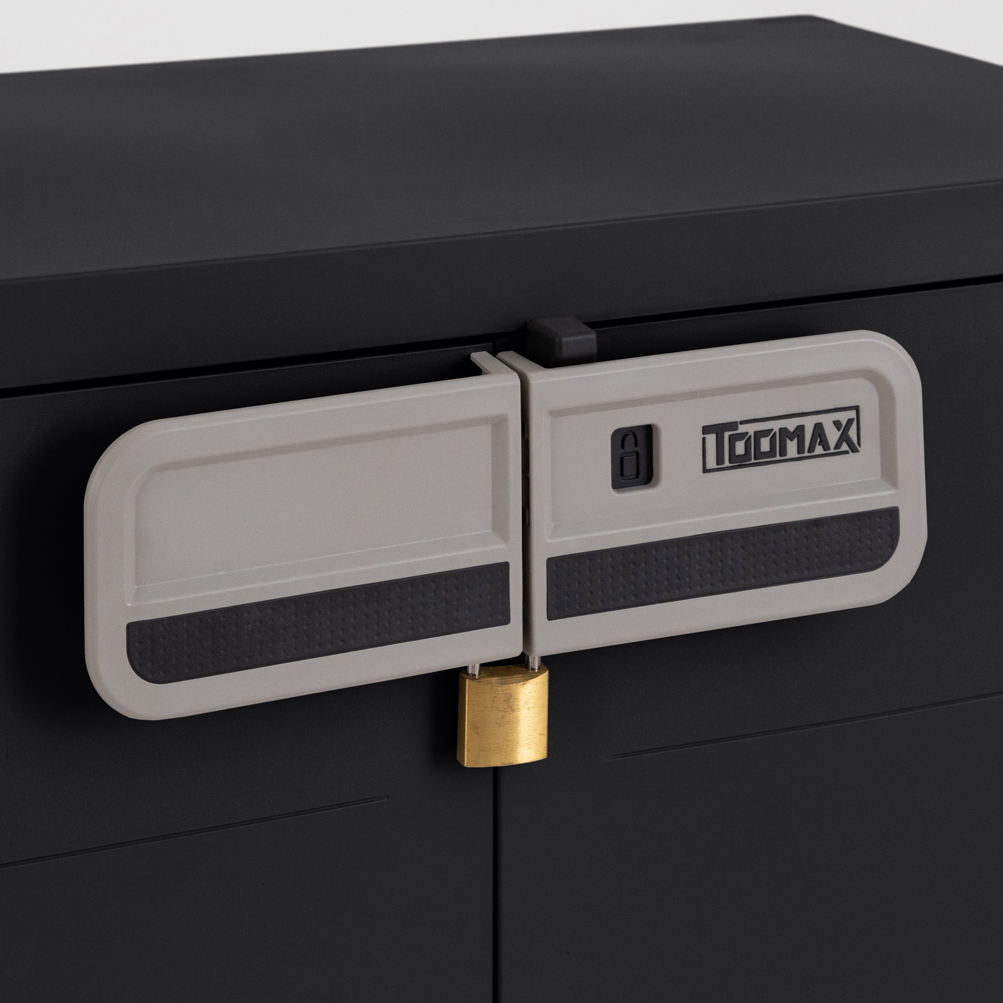 Η ντουλάπα διαθέτει δυνατότητα ασφαλούς κλειδώματος (το λουκέτο δεν περιλαμβάνεται), ενώ στο εσωτερικό της περιλαμβάνει ένα ράφι για την οργάνωση των αντικειμένων σας. Στην πίσω πλευρά υπάρχουν οπές στήριξης που επιτρέπουν τη βίδωσή της στον τοίχο, προσφέροντας μέγιστη ασφάλεια σε περίπτωση ισχυρών ανέμων.