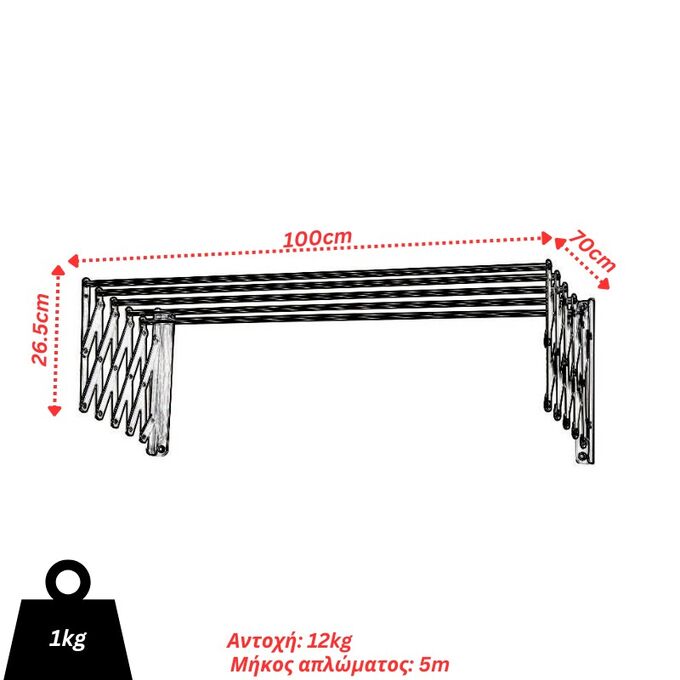 Πτυσσόμενη απλώστρα τοίχου, κατασκευασμένη 100% από αλουμίνιο (στηρίγματα, μπράτσα και βέργες αλουμινίου) για μέγιστη αντοχή στο χρόνο, στις καιρικές συνθήκες και προστασία από διαβρώσεις. Διαθέτει μήκος απλώματος 5 μέτρα σε πλήρη ανάπτυξη ενώ όταν δε χρησιμοποιείται κλείνει και μπορεί να χρησιμοποιηθεί και ως κρεμάστρα. Κατάλληλη για εσωτερικούς και εξωτερικούς χώρους τόσο για οικιακή όσο και για επαγγελματική χρήση (ξενοδοχεία, ενοικιαζόμενα δωμάτια, airbnb). Τοποθετείται εύκολα στον τοίχο με δραπανοκατσάβιδο (περιλαμβάνονται βίδες-ούπα για τη στήριξη). Μπορείτε να την συνδυάσετε με μανταλάκια από τη γκάμα μας.