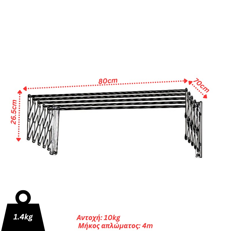 Πτυσσόμενη απλώστρα τοίχου, κατασκευασμένη 100% από αλουμίνιο (μπράτσα, στηρίγματα και βέργες αλουμινίου) για μέγιστη αντοχή στο χρόνο, στις καιρικές συνθήκες και προστασία από διαβρώσεις. Διαθέτει μήκος απλώματος 4 μέτρα σε πλήρη ανάπτυξη ενώ όταν δε χρησιμοποιείται κλείνει και μπορεί να χρησιμοποιηθεί και ως κρεμάστρα. Κατάλληλη για εσωτερικούς και εξωτερικούς χώρους τόσο για οικιακή όσο και για επαγγελματική χρήση (ξενοδοχεία, ενοικιαζόμενα δωμάτια, airbnb). Τοποθετείται εύκολα στον τοίχο με δραπανοκατσάβιδο (περιλαμβάνονται βίδες-ούπα για τη στήριξη). Μπορείτε να την συνδυάσετε με μανταλάκια από τη γκάμα μας.
