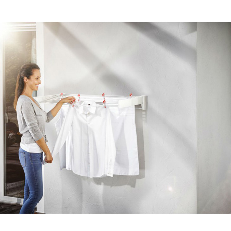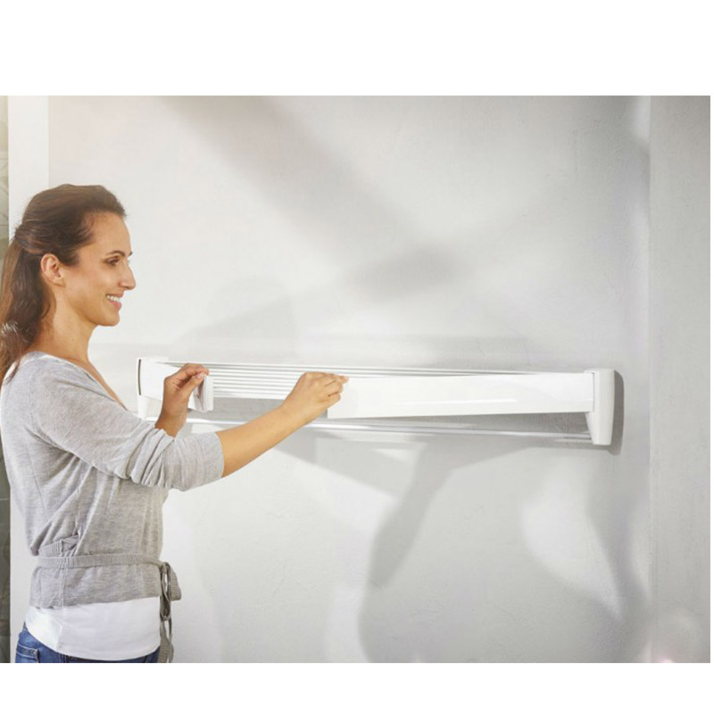 Πτυσσόμενη απλώστρα τοίχου, κατασκευασμένη από ανθεκτικό πλαστικό ABS, 5 τηλεσκοπικές μεταλλικές βέργες βαμμένες ηλεκτροστατικά και 1 ανοξείδωτη βέργα.