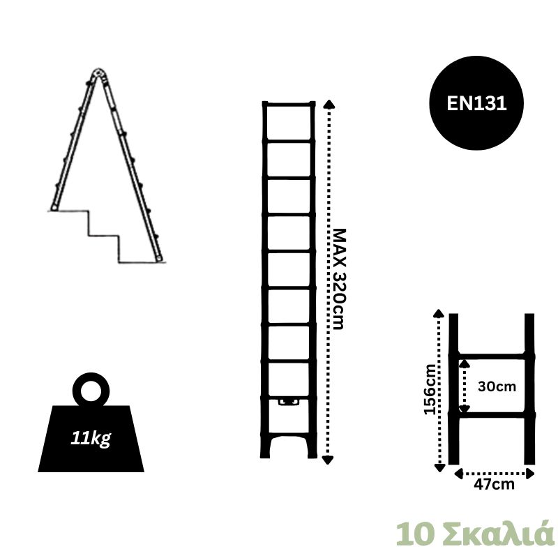 Τηλεσκοπική σκάλα με 10 (5+5) σκαλιά, κατασκευασμένη εξ'ολοκλήρου από αλουμίνιο με πλαστικές λεπτομέρειες. Συμπαγής κατασκευή που συνδυάζει ρυθμιζόμενο ύψος (από 82 έως 320 εκατοστά), μεγάλη αντοχή βάρους (έως 150kg) και μικρό βάρος κατασκευής (μόλις 11kg).