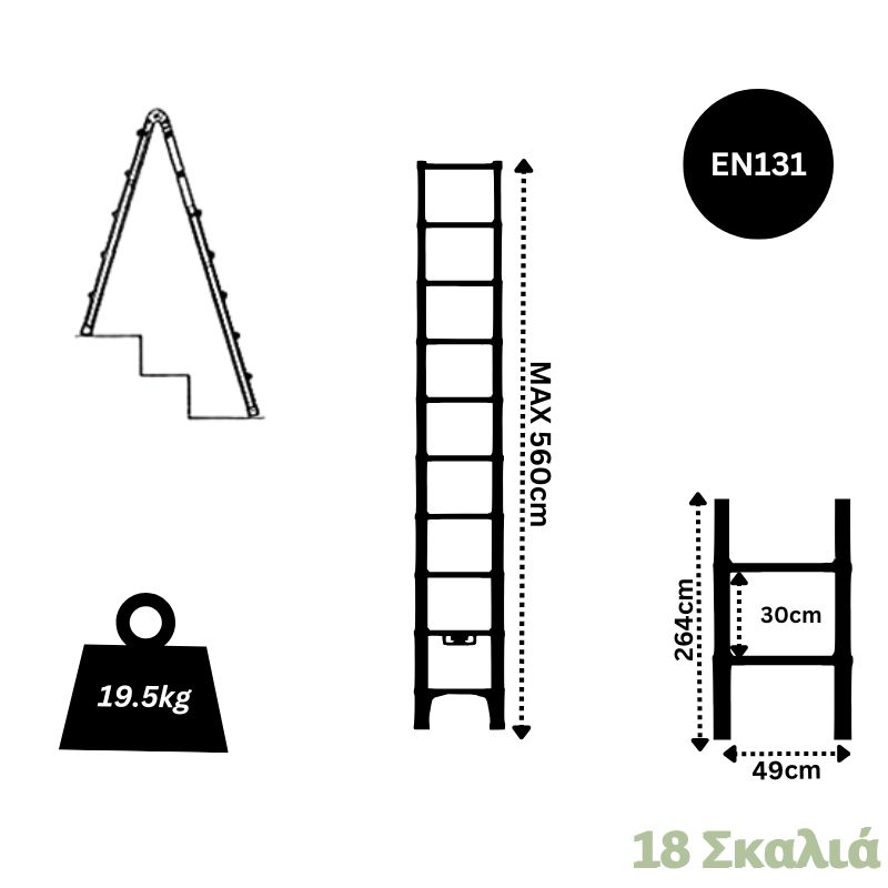 Τηλεσκοπική σκάλα με 18 (9+9) σκαλιά, κατασκευασμένη εξ'ολοκλήρου από αλουμίνιο με πλαστικές λεπτομέρειες. Συμπαγής κατασκευή που συνδυάζει ρυθμιζόμενο ύψος (από 94 έως 560 εκατοστά), μεγάλη αντοχή βάρους (έως 150kg) και μικρό βάρος κατασκευής (μόλις 19.5kg).