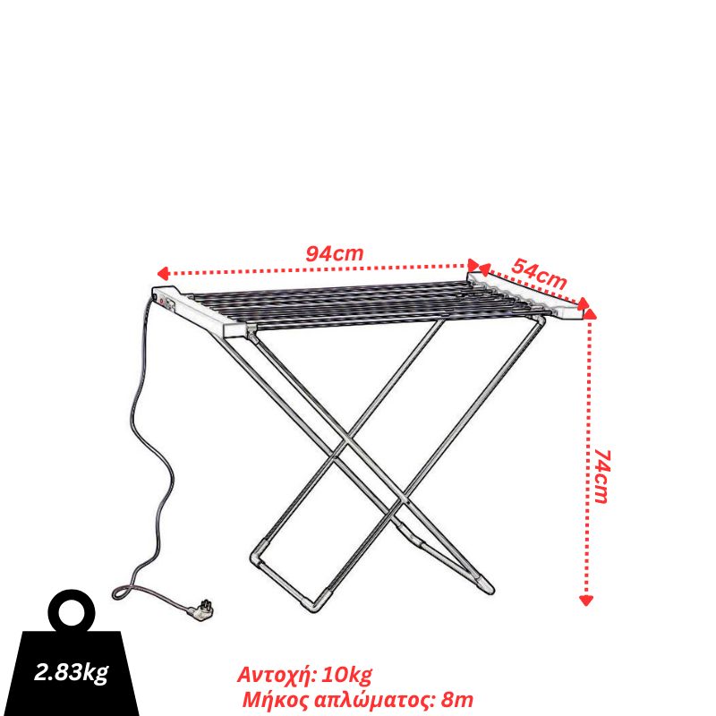 Θερμαινόμενη ηλεκτρική απλώστρα κατασκευασμένη από 100% αλουμίνιο (πόδια, βέργες) και ανθεκτικό πλαστικό. Διαθέτει 8 θερμαινόμενες βέργες αλουμινίου, διακόπτη ON/OFF με φωτεινή ένδειξη λειτουργίας και κάλυμμα σιλικόνης για προστασία από το νερό, φις σούκο για μέγιστη ασφάλεια και καλώδιο μήκους 1,4m. Η κατασκευή από αλουμίνιο συντελεί στην άμεση μεταφορά της θερμότητας σε όλο το μήκος των βεργών (θερμαίνεται στους 45-55°C εντός 5 λεπτών) και καθιστά την απλώστρα ελαφριά και επομένως εύκολη στην μεταφορά. Η απλώστρα είναι πτυσσόμενη, διπλώνει και αποθηκεύεται εύκολα χωρίς να πιάνει πολύ χώρο. Ιδανική επιλογή για το άπλωμα των ρούχων εντός σπιτιού, ειδικά το χειμώνα, για περιοχές και σπίτια με υψηλά επίπεδα υγρασίας ενώ μπορεί να χρησιμοποιηθεί και σαν απλή απλώστρα χωρίς τη σύνδεση σε πρίζα. Έχει χαμηλή κατανάλωση (ισχύς 120W), διαθέτει αδιάβροχη προστασία IPX1 και συμμορφώνεται με τα ευρωπαϊκά πρότυπα ασφαλείας (πιστοποίηση CE). Διατίθεται στο χρώμα του αλουμινίου με γκρί πλαστικές λεπτομέρειες.