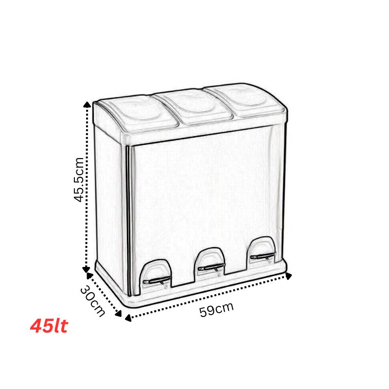 VESTA Κάδος Απορριμμάτων ΙΝΟΧ 45lt (3x15lt) 59x30x45.5cm με Πεντάλ 3 Θέσεων 3 Εσωτερικούς Κάδους Ανακύκλωσης 6.4Kg Κουζίνας