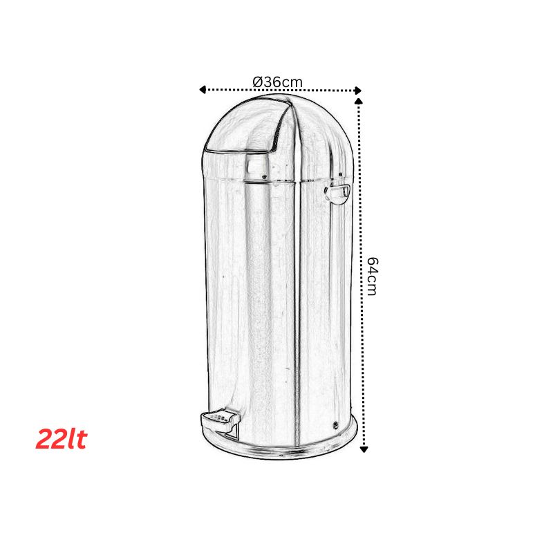 Κυλινδρικό δοχείο απορριμμάτων διαμέτρου 36 εκατοστών και χωρητικότητας 22 λίτρων. Κατασκευασμένο από ανοξείδωτο ματ χάλυβα (inox) βαρέως τύπου. Το δοχείο είναι υψηλής αντοχής ενώ διαθέτει ταυτόχρονα κομψή εμφάνιση. Στο εσωτερικό του υπάρχει δεύτερος κάδος από γαλβανιζέ λαμαρίνα όπου τοποθετούνται τα απορρίμματα. Ιδανική επιλογή τόσο για επαγγελματικούς όσο και για οικιακούς, εσωτερικούς ή εξωτερικούς χώρους, ταιριάζοντας αρμονικά με κάθε σχεδιαστικό ύφος. Διαθέτει καινοτόμο μηχανισμό ανοίγματος με το πόδι (πεντάλ) και το καπάκι ανοίγει προς τα μέσα εξοικονομώντας χώρο. Η μετακίνηση του εξωτερικού δοχείου και ο καθαρισμός του εσωτερικού γαλβανισμένου δοχείου από τα απορρίμματα γίνεται πανεύκολα.