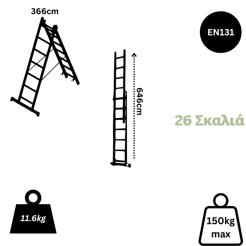 VESTA Σκάλα Αλουμινίου 2x13 Σκαλιά Αναπτυσσόμενη 6.46m Διπλή-Σχήμα ''Λ'' με Βάση Στηρίγματος 11.6kg Αντοχή 150kg