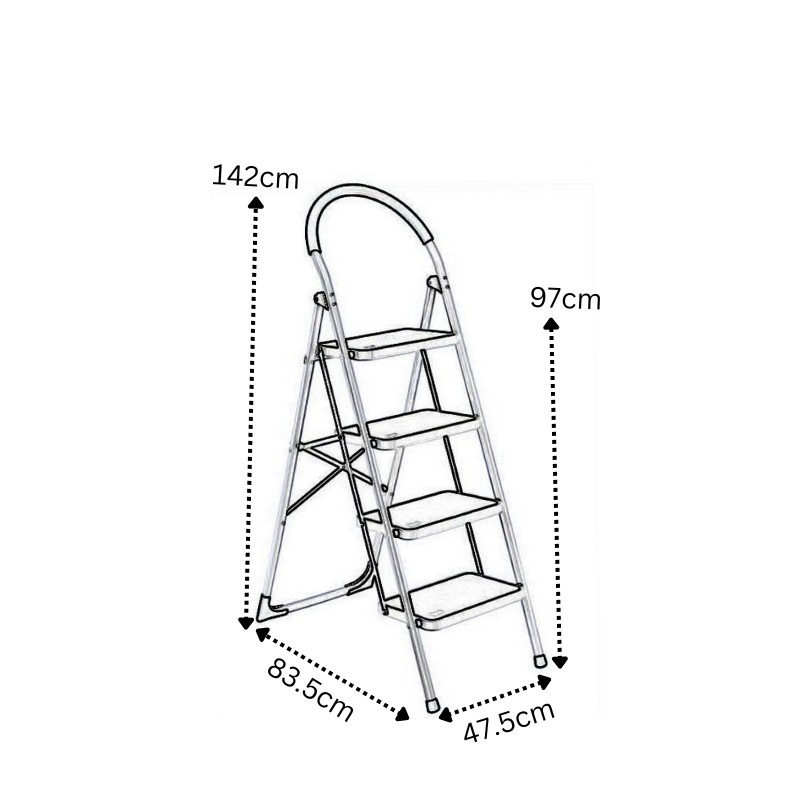 Διαθέτει 4 σκαλοπάτια με αντιολισθητική λαστιχένια βάση και μεταλλικές αντιρρίδες στη πλάτη και στις άκρες των σκαλοπατιών προσφέροντας extra προστασία και αποφυγή κινδύνων και χειρολαβή με λαστιχένια επίστρωση.
