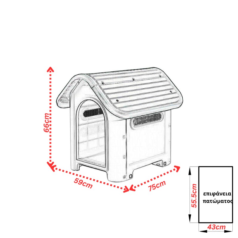 Λόγω του εργονομικού σχεδιασμού του, εξασφαλίζει τις καλύτερες συνθήκες υγιεινής αφού διαθέτει αεραγωγούς και στις δύο πλευρές. Είναι υπερυψωμένο καθώς διαθέτει τέσσερα πόδια που καθιστούν το εσωτερικό του πιο καθαρό και ασφαλέστερο από τα νερά της βροχής. Η σκεπή του είναι δίρριχτη με κλίση στις πλαϊνές πλευρές για την καλύτερη απορροή του νερού δεξιά και αριστερά και όχι πάνω από την είσοδο που κάθεται το κατοικίδιο.