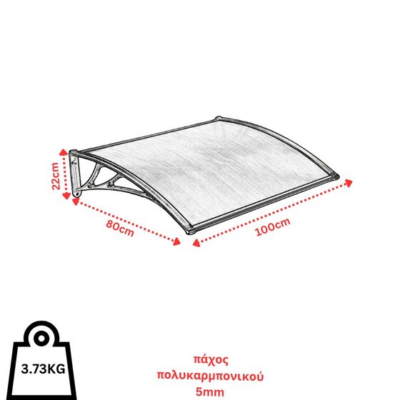 Στέγαστρο πόρτας και παραθύρου διαστάσεων 100cm Χ 80cm (πλάτος X βάθος). Οι βραχίονες είναι κατασκευασμένοι από πλαστικό ABS, η πίσω και η μπροστινή βέργα είναι κατασκευασμένες από αλουμίνιο και τα φύλλα από πολυκαρμπονικό πάνελ πάχους 5mm.