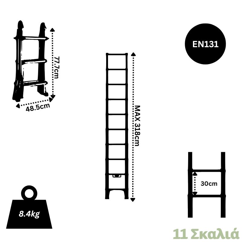 Τηλεσκοπική σκάλα με 10+1 σκαλιά, κατασκευασμένη εξ'ολοκλήρου από αλουμίνιο με πλαστικές λεπτομέρειες. Συμπαγής κατασκευή που συνδυάζει ρυθμιζόμενο ύψος (από 18 έως 318 εκατοστά), μεγάλη αντοχή βάρους (έως 150kg) και ελάχιστο βάρος κατασκευής (μόλις 8,4kg). Ιδανική επιλογή για επαγγελματίες που επιθυμούν να ''μαστορεύουν'' με ασφάλεια καθώς διαθέτει σύστημα ασφαλούς κλειδώματος στο επιθυμητό ύψος. Φέρει πιστοποίηση EN131.