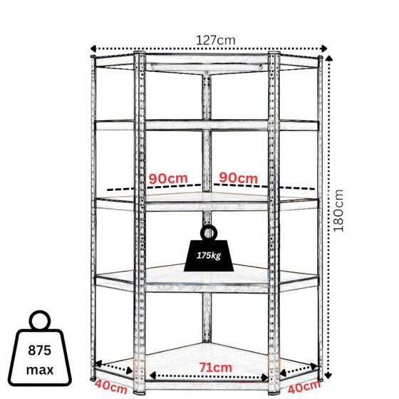 Μεταλλική γωνιακή ραφιέρα τύπου dexion 5 επιπέδων κατασκευασμένη εξ 'ολοκλήρου από γαλβανισμένο μέταλλο για μεγαλύτερη αντοχή στο χρόνο, τις διαβρώσεις και την καθημερινή χρήση.