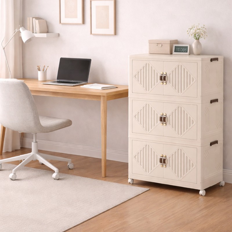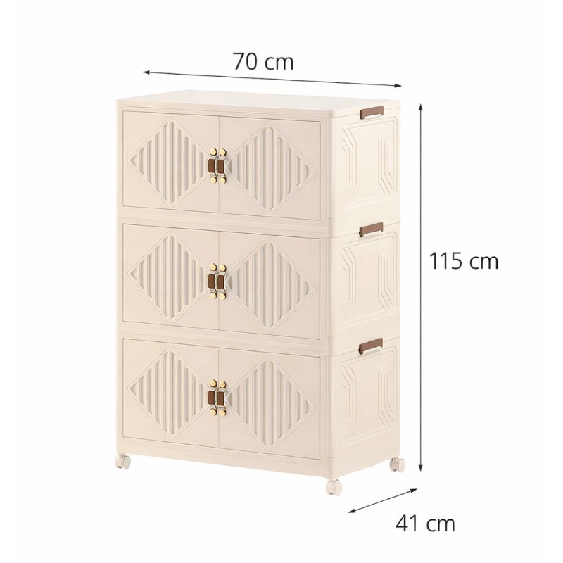 H VESTA Πλαστική ντουλάπα αποθήκευσης - συρταριέρα 3 επιπέδων αποτελεί την ιδανική λύση για οργανωμένους και λειτουργικούς χώρους, συνδυάζοντας τον κομψό σχεδιασμό με τη μέγιστη  πρακτικότητα. Ο μοντέρνος σχεδιασμός της σε ουδέτερο χρώμα την καθιστά κατάλληλη για κάθε χώρο του σπιτιού ή της επιχείρησης, ενώ η κάθετη κατασκευή της εξοικονομεί πολύτιμο χώρο χωρίς να περιορίζει τη χωρητικότητα.