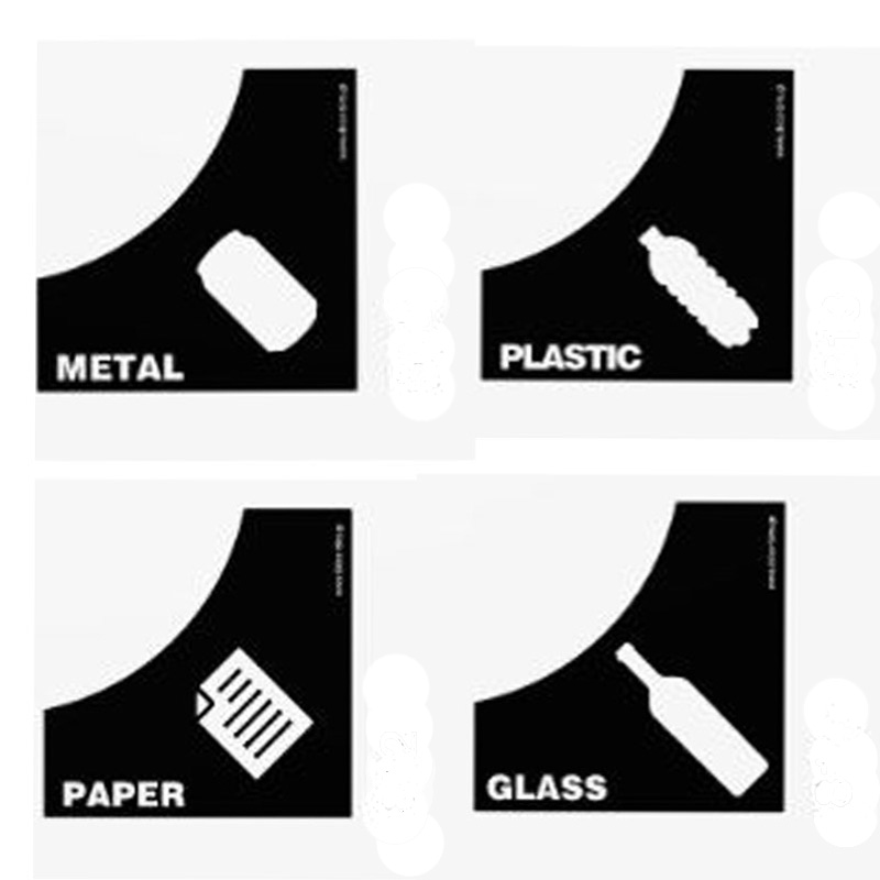 Η ετικέτα αναγράφει, με διάφανα γράμματα και εικονίδιο -που εμφανίζεται στο χρώμα του καπακιού του κάδου, τον τύπο των υλικών που μπορούν να ανακυκλωθούν, σε μαύρο φόντο.