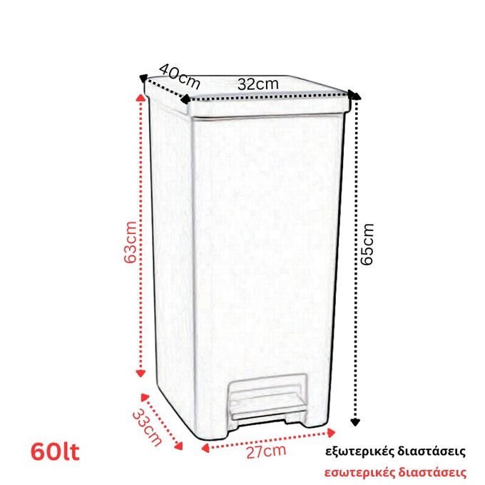Εσωτερικά διαθέτει πλαστικό στεφάνι για την τοποθέτηση σακουλών απορριμμάτων, εξασφαλίζοντας σταθερότητα και καθαριότητα.