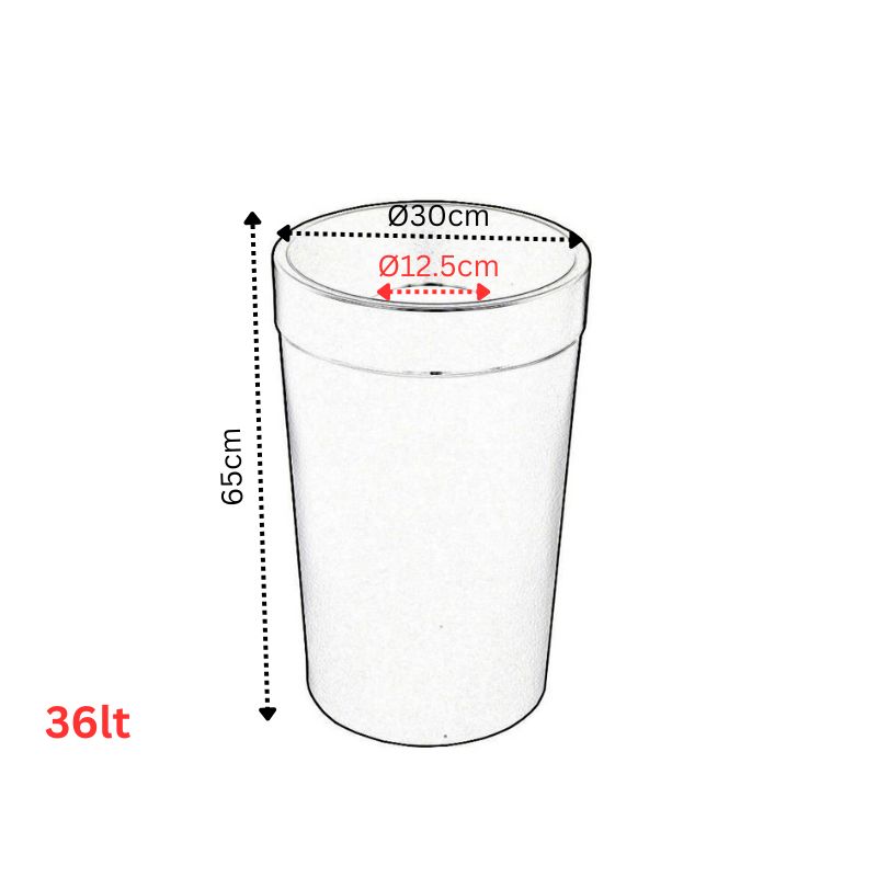 Στρογγυλός πλαστικός κάδος ανακύκλωσης με χωρητικότητα 36 λίτρων. Το άνοιγμα στο καπάκι εξυπηρετεί στην γρήγορη ρίψη των απορριμάτων, διευκολύνοντας την χρήση.